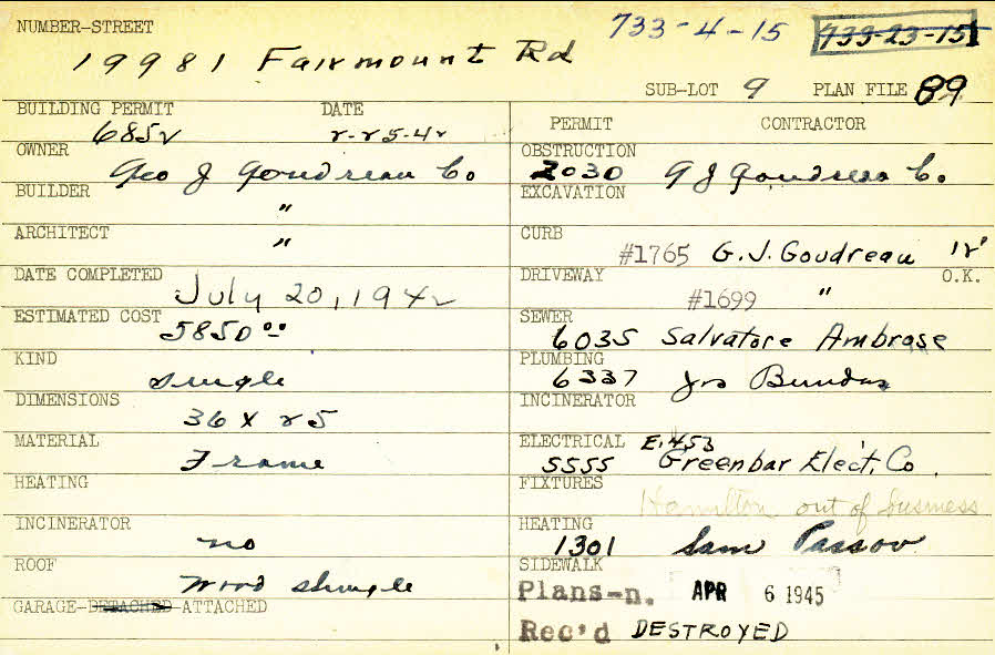 19981 Fairmount Boulevard Shaker Heights, OH 44120 PARCEL ID: 733-04-015 Building Permit Date: 02-25-1942 Plan File Number: 89 Neighborhood: Malvern Owner: George J. Goudreau Company Builder: George J. Goudreau Company Architect: George J. Goudreau Company Estimated Cost: 5850 Date Completed: 07-20-1942 Kind: Single, Single Residence or Dwelling Material: Frame Roof: Wood Shingle Garage: attached Card Available: yes |