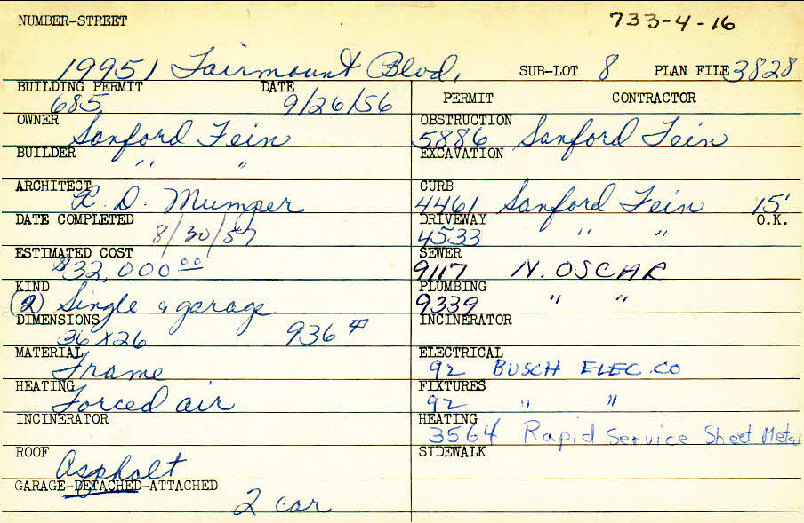 19951 Fairmount Boulevard Shaker Heights, OH 44120 PARCEL ID: 733-04-016 Building Permit Date: 09-26-1956 Plan File Number: 3828, 12795 Microfilm Roll: Roll#56, NewRoll#15 Neighborhood: Malvern Owner: Fein, Sanford Builder: Fein, Sanford Architect: Mumper, R. D. Estimated Cost: 32000 Date Completed: 08-30-1957 Kind: Single Dwelling and Garage (2) Material: Frame Heating: Forced Air Roof: Asphalt Garage: detached 2 car |