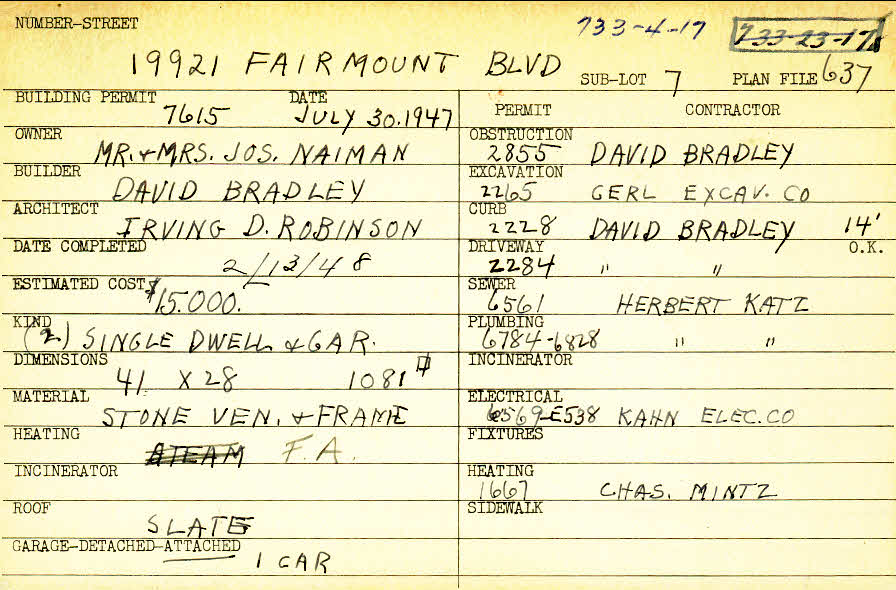 19921 Fairmount Boulevard Shaker Heights, OH 44120 PARCEL ID: 733-04-017 Building Permit Date: 07-30-1947 Plan File Number: 637 all scanned Microfilm Roll: Roll008 Neighborhood: Malvern Owner: Naiman, Joseph Mr. and Mrs. Builder: Bradley, David Architect: Robinson, Irving D. Estimated Cost: 15000 Date Completed: 02-13-1948 Kind: Single Dwelling and Garage (2) Material: Stone Veneer and Frame Heating: Forced Air Roof: Slate Garage: attached |