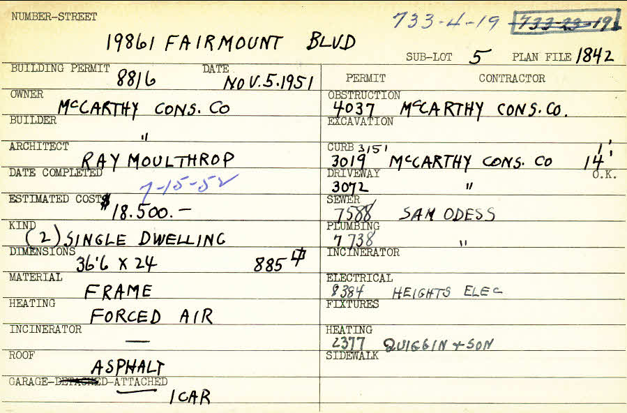 19861 Fairmount Boulevard Shaker Heights, OH 44120 PARCEL ID: 733-04-019 Building Permit Date: 11-05-1951 Plan File Number: 1842 all scanned Microfilm Roll: Roll027 Neighborhood: Malvern Owner: McCarthy Construction Company Builder: McCarthy Construction Company Architect: Moulthrop, Ray Estimated Cost: 18500 Date Completed: 07-15-1952 Kind: Single, Single Residence or Dwelling (2) Material: Frame Heating: Forced Air Roof: Asphalt Garage: attached |