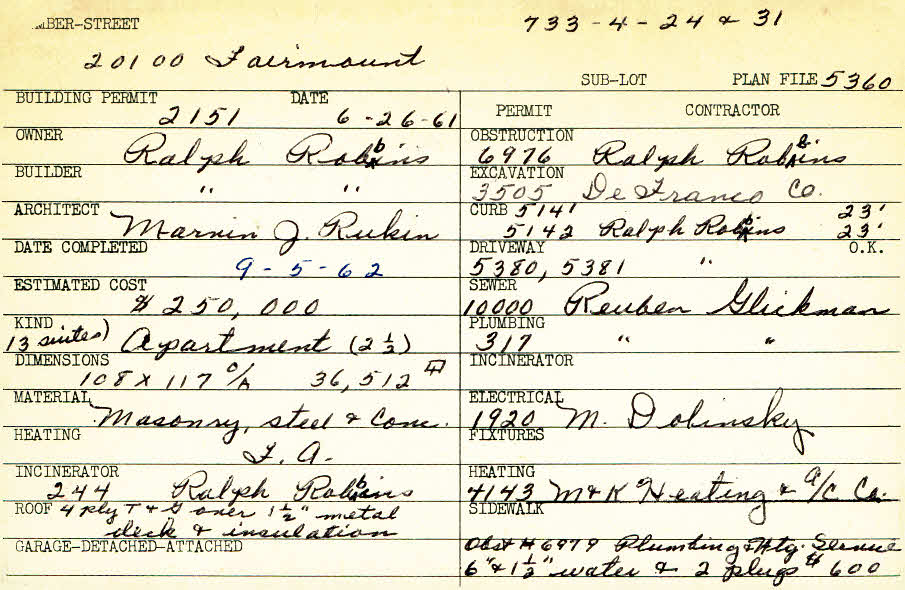 20100 Fairmount Boulevard Shaker Heights, OH 44120 PARCEL ID: 733-04-024 Building Permit Date: 06-26-1961 Plan File Number: 5360 Microfilm Roll: Roll#73 Neighborhood: Malvern Owner: Robbins, Ralph Builder: Robbins, Ralph Architect: Rukin, Marvin J. Estimated Cost: 250000 Date Completed: 09-05-1962 Kind: Apartment or Multi-family (3+) Material: Masonry, Steel and Concrete Heating: Forced Air |