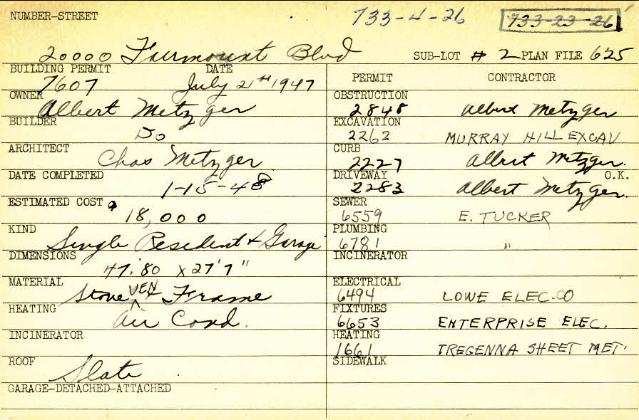 20000 Fairmount Boulevard Shaker Heights, OH 44120 PARCEL ID: 733-04-026 Building Permit Date: 07-21-1947 Plan File Number: 625, 4516 all scanned Microfilm Roll: Roll008, Roll063 Neighborhood: Malvern Owner: Metzger, Albert Builder: Metzger, Albert Architect: Metzger, Charles A. Estimated Cost: 18000 Date Completed: 01-15-1948 Kind: Single Dwelling and Garage Material: Stone Veneer and Frame Heating: Air Conditioned Roof: Slate |