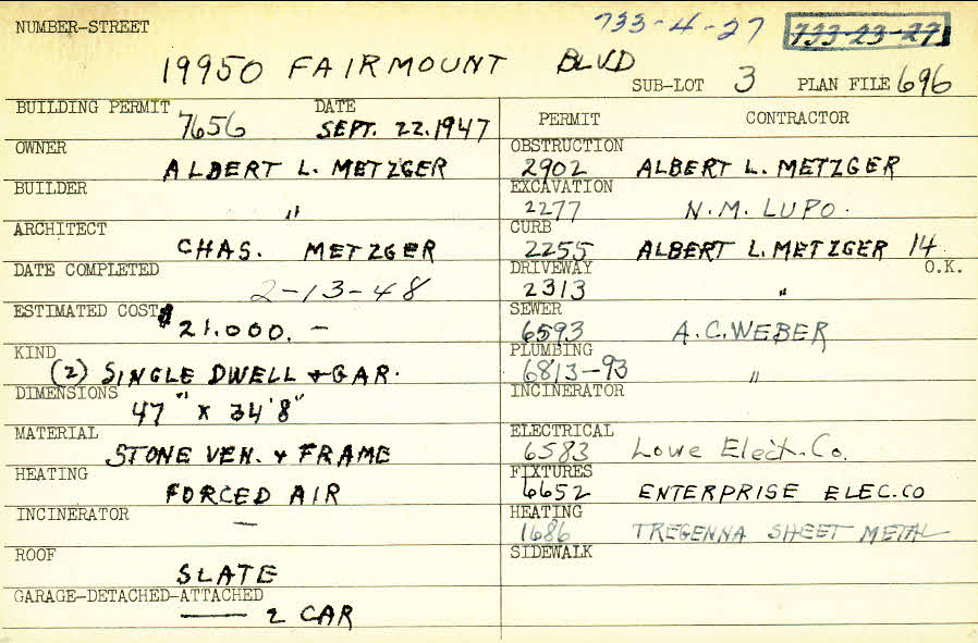 19950 Fairmount Boulevard Shaker Heights, OH 44120 PARCEL ID: 733-04-027 Building Permit Date: 09-22-1947 Plan File Number: 696 all scanned Microfilm Roll: Roll008 Neighborhood: Malvern Owner: Metzger, Albert L. Builder: Metzger, Albert L. Architect: Metzger, Charles A. Estimated Cost: 21000 Date Completed: 02-13-1948 Kind: Single Dwelling and Garage (2) Material: Stone Veneer and Frame Heating: Forced Air Roof: Slate Garage: attached 2 car |