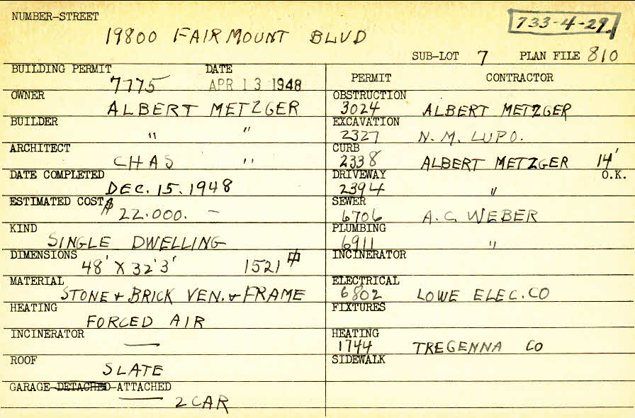 19800 Fairmount Boulevard Shaker Heights, OH 44120 PARCEL ID: 733-04-029 Building Permit Date: 04-13-1948 Plan File Number: 810 scanned, 11679 Microfilm Roll: Roll011, NewRoll#8 Neighborhood: Malvern Owner: Metzger, Albert Builder: Metzger, Albert Architect: Metzger, Charles A. Estimated Cost: 22000 Date Completed: 12-15-1948 Kind: Single, Single Residence or Dwelling Material: Stone and Brick Veneer and Frame Heating: Forced Air Roof: Slate Garage: attached 2 car |