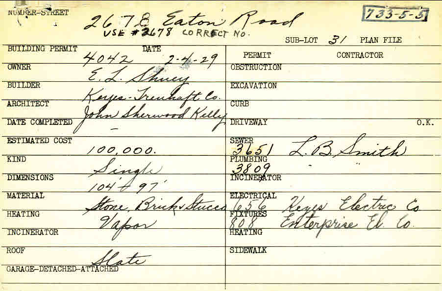 2678 Eaton Road Shaker Heights, OH 44122 PARCEL ID: 733-05-005 Building Permit Date: 02-04-1929 Plan File Number: 7549, 92-140 all scanned Microfilm Roll: Roll#93, NewRoll#1 Neighborhood: Malvern Owner: Shuey, E. L. Builder: Keyes-Treuhaft Company Architect: Kelly, John Sherwood Estimated Cost: 100000 Kind: Single, Single Residence or Dwelling Material: Stone, Brick and Stucco Heating: Vapor Roof: Slate |