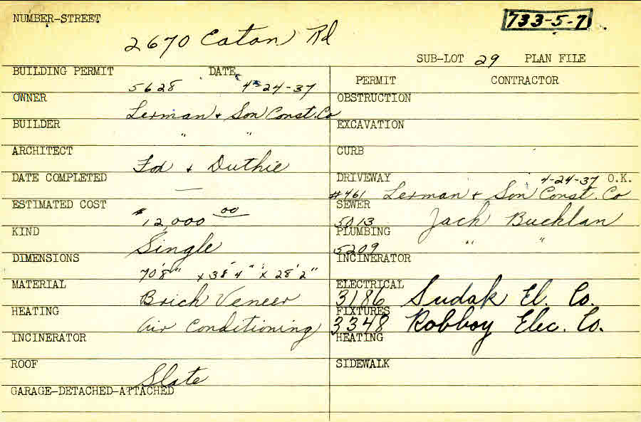 2670 Eaton Road Shaker Heights, OH 44122 PARCEL ID: 733-05-007 Building Permit Date: 04-24-1937 Plan File Number: 10850, 10883 Microfilm Roll: NewRoll#6 Neighborhood: Malvern Owner: Lerman and Son Construction Company Builder: Lerman and Son Construction Company Architect: Fox and Duthie Estimated Cost: 12000 Kind: Single, Single Residence or Dwelling Material: Brick Veneer Heating: Air Conditioned Roof: Slate |