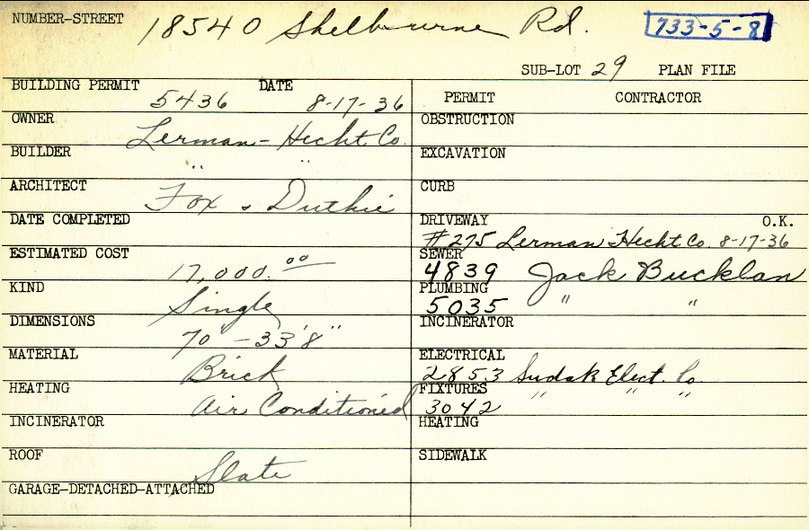 18540 Shelburne Road Shaker Heights, OH 44120 PARCEL ID: 733-05-008 Building Permit Date: 08-17-1936 Plan File Number: 0 Neighborhood: Malvern Owner: Lerman-Hecht Company Builder: Lerman-Hecht Company Architect: Fox and Duthie Estimated Cost: 17000 Kind: Single, Single Residence or Dwelling Material: Brick Heating: Air Conditioned Roof: Slate Card Available: yes |