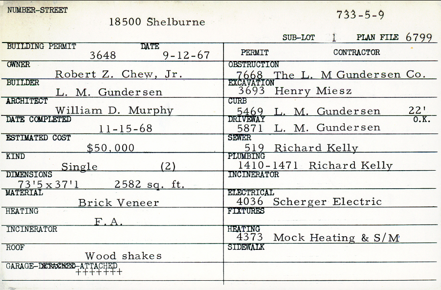 18500 Shelburne Road Shaker Heights, OH 44120 PARCEL ID: 733-05-009 Building Permit Date: 09-12-1967 Plan File Number: 6799 Neighborhood: Malvern Owner: Chew, Robert Z. Jr. Builder: Gunderson, L. M. Architect: Murphy, William D. Estimated Cost: 50000 Date Completed: 11-15-1968 Kind: Single, Single Residence or Dwelling (2) Material: Brick Veneer Heating: Forced Air Roof: Wood Shakes Garage: attached |