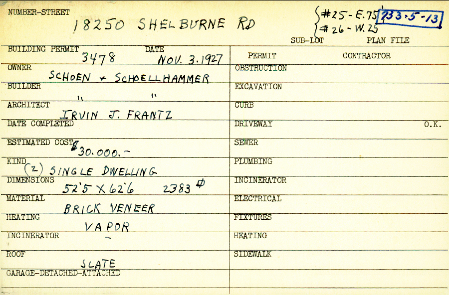 18250 Shelburne Road Shaker Heights, OH 44120 PARCEL ID: 733-05-013 Building Permit Date: 11-03-1927 Plan File Number: 0 Neighborhood: Malvern Owner: Schoen and Schoellhammer Builder: Schoen and Schoellhammer Architect: Frantz, Irvin J. Estimated Cost: 30000 Kind: Single, Single Residence or Dwelling (2) Material: Brick Veneer Heating: Vapor Roof: Slate Card Available: yes |