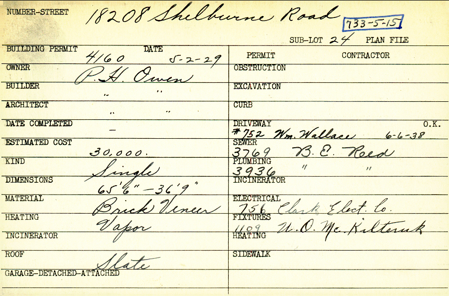 18208 Shelburne Road Shaker Heights, OH 44122 PARCEL ID: 733-05-015 Building Permit Date: 05-02-1929 Plan File Number: 5154 all scanned Microfilm Roll: Roll070 Neighborhood: Malvern Owner: Owen, P. H. Builder: Owen, P. H. Architect: Owen, P. H. Estimated Cost: 30000 Kind: Single, Single Residence or Dwelling Material: Brick Veneer Heating: Vapor Roof: Slate Blueprints: online, see link above |