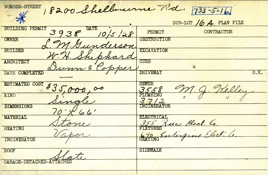 18200 Shelburne Road Shaker Heights, OH 44122 PARCEL ID: 733-05-016 Building Permit Date: 10-05-1928 Plan File Number: 0 Neighborhood: Malvern Owner: Gunderson, L. M. Builder: Shephard, W. H. Architect: Dunn and Copper Estimated Cost: 35000 Kind: Single, Single Residence or Dwelling Material: Stone Heating: Vapor Roof: Slate Card Available: yes |