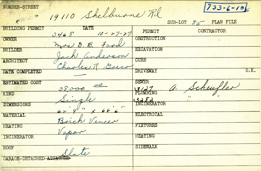 19110 Shelburne Road Shaker Heights, OH 44122 PARCEL ID: 733-06-010 Building Permit Date: 10-27-1927 Plan File Number: 3192, 4524 all scanned Microfilm Roll: Roll044, Roll063 Neighborhood: Malvern Owner: Ford, Mrs. D. B. Builder: Anderson, Jack Architect: Greco, Charles R. Estimated Cost: 38000 Kind: Single, Single Residence or Dwelling Material: Brick Veneer Heating: Vapor Roof: Slate Garage: detached Blueprints: online, see link above |