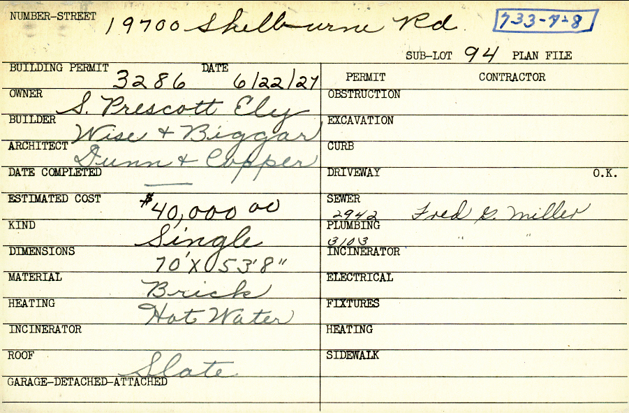 19700 Shelburne Road Shaker Heights, OH 44122 PARCEL ID: 733-07-008 Building Permit Date: 06-22-1927 Plan File Number: 0 Neighborhood: Malvern Owner: Ely, S. Prescott Builder: Wise and Biggar Architect: Dunn and Copper Estimated Cost: 40000 Kind: Single, Single Residence or Dwelling Material: Brick Heating: Hot Water Roof: Slate |