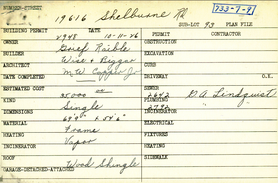 19616 Shelburne Road Shaker Heights, OH 44122 PARCEL ID: 733-07-009 Building Permit Date: 10-11-1926 Plan File Number: 3954, 6651 Microfilm Roll: Roll#58, Roll#87 Neighborhood: Malvern Owner: Raible, Grief Builder: Wise and Biggar Architect: Copper, Munroe Walker Jr. Estimated Cost: 35000 Kind: Single, Single Residence or Dwelling Material: Frame Heating: Vapor Roof: Wood Shingle |