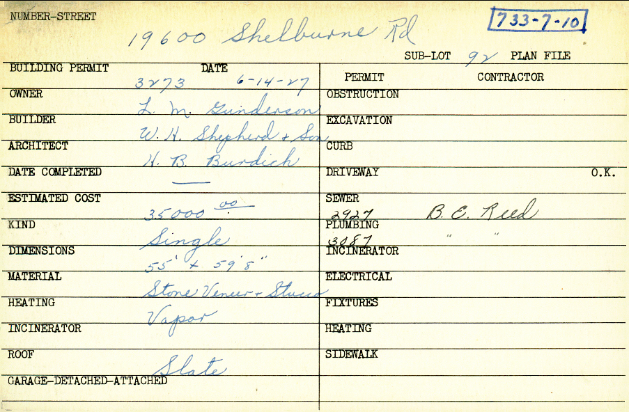 19600 Shelburne Road Shaker Heights, OH 44122 PARCEL ID: 733-07-010 Building Permit Date: 06-14-1927 Plan File Number: 6216 Microfilm Roll: Roll#84 Neighborhood: Malvern Owner: Gunderson, L. M. Builder: W. H. Shepherd and Son Architect: Burdick, H. B. Estimated Cost: 35000 Kind: Single, Single Residence or Dwelling Material: Stone Veneer and Stucco Heating: Vapor Roof: Slate |