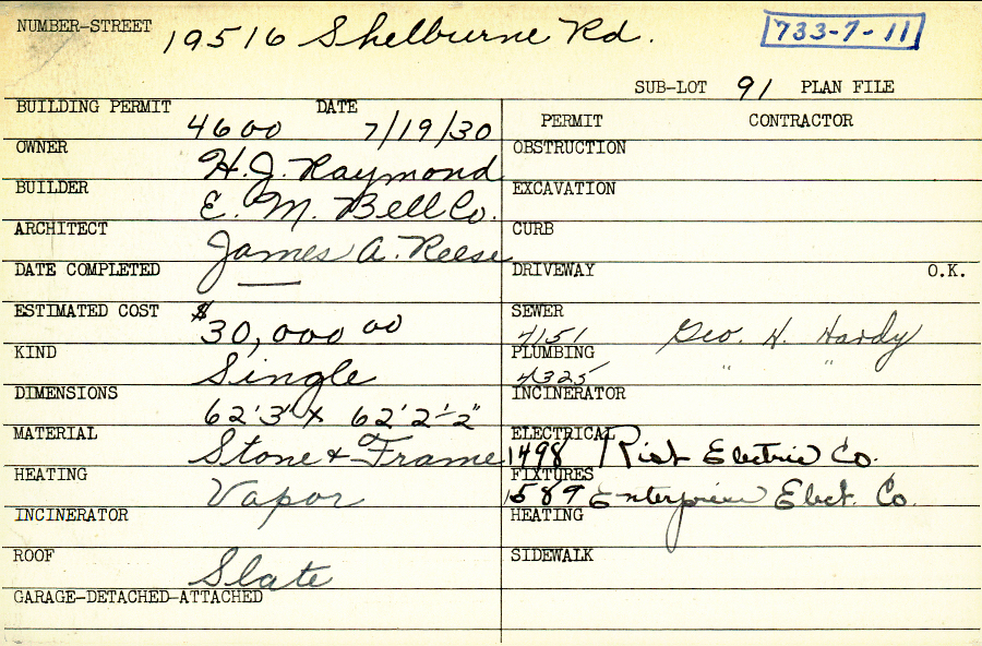 19516 Shelburne Road Shaker Heights, OH 44122 PARCEL ID: 733-07-011 Building Permit Date: 07-19-1930 Plan File Number: 5210 Microfilm Roll: Roll#72 Neighborhood: Malvern Owner: Raymond, H. J. Builder: E. M. Bell Company Architect: Reese, James A. Estimated Cost: 30000 Kind: Single, Single Residence or Dwelling Material: Stone and Frame Heating: Vapor Roof: Slate |