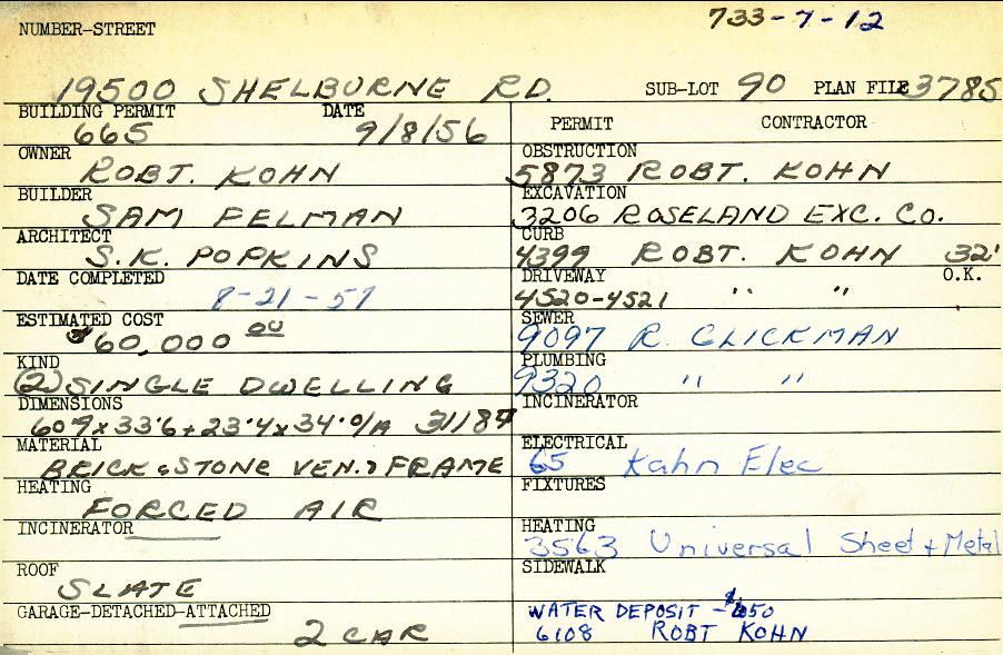 19500 Shelburne Road Shaker Heights, OH 44122 PARCEL ID: 733-07-012 Building Permit Date: 09-08-1956 Plan File Number: 3785 Microfilm Roll: Roll#56 Neighborhood: Malvern Owner: Kohn, Robert Builder: Felman, Sam Architect: Popkins, S. K. Estimated Cost: 60000 Date Completed: 08-21-1957 Kind: Single, Single Residence or Dwelling (2) Material: Brick and Stone Veneer and Frame Heating: Forced Air Roof: Slate Garage: attached 2 car |