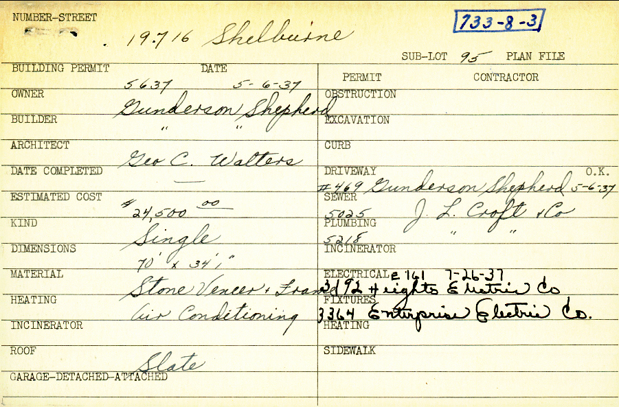 19716 Shelburne Road Shaker Heights, OH 44122 PARCEL ID: 733-08-003 Building Permit Date: 05-06-1937 Plan File Number: 6832, 10736 Microfilm Roll: Roll#88, NewRoll#5 Neighborhood: Malvern Owner: Gunderson Shepherd Builder: Gunderson Shepherd Architect: Walters, George C. Estimated Cost: 24500 Kind: Single, Single Residence or Dwelling Material: Stone Veneer and Frame Heating: Air Conditioned Roof: Slate |