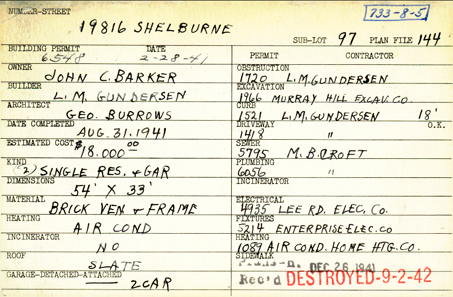19816 Shelburne Road Shaker Heights, OH 44122 PARCEL ID: 733-08-005 Building Permit Date: 02-28-1941 Plan File Number: 144 Neighborhood: Malvern Owner: Barker, John C. Builder: Gundersen, L. M. Architect: Burrows, George Estimated Cost: 18000 Date Completed: 08-31-1941 Kind: Single Dwelling and Garage (2) Material: Brick Veneer and Frame Heating: Air Conditioned Roof: Slate Garage: attached 2 car |