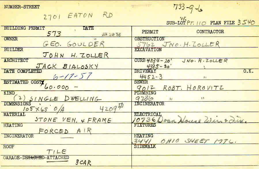 2701 Eaton Road Shaker Heights, OH 44122 PARCEL ID: 733-09-006 Building Permit Date: 06-20-1956 Plan File Number: 3540, 4427 Microfilm Roll: Roll#52, Roll#63 Neighborhood: Malvern Owner: Goulder, George Builder: Zoller, John H. Architect: Bialosky, Jack A. Estimated Cost: 60000 Date Completed: 06-17-1957 Kind: Single, Single Residence or Dwelling (2) Material: Stone Veneer and Frame Heating: Forced Air Roof: Tile Garage: attached 3 car |