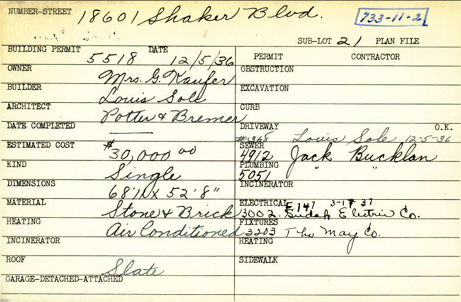 18601 Shaker Boulevard Shaker Heights, OH 44122 PARCEL ID: 733-11-002 Building Permit Date: 12-05-1936 Plan File Number: 9231 Microfilm Roll: Roll#102 Neighborhood: Malvern Owner: Kaufer, Mrs. G. Builder: Sole, Louis Architect: J. Ellsworth Potter and Harry F. Bremmer Estimated Cost: 30000 Kind: Single, Single Residence or Dwelling Material: Stone and Brick Heating: Air Conditioned Roof: Slate |