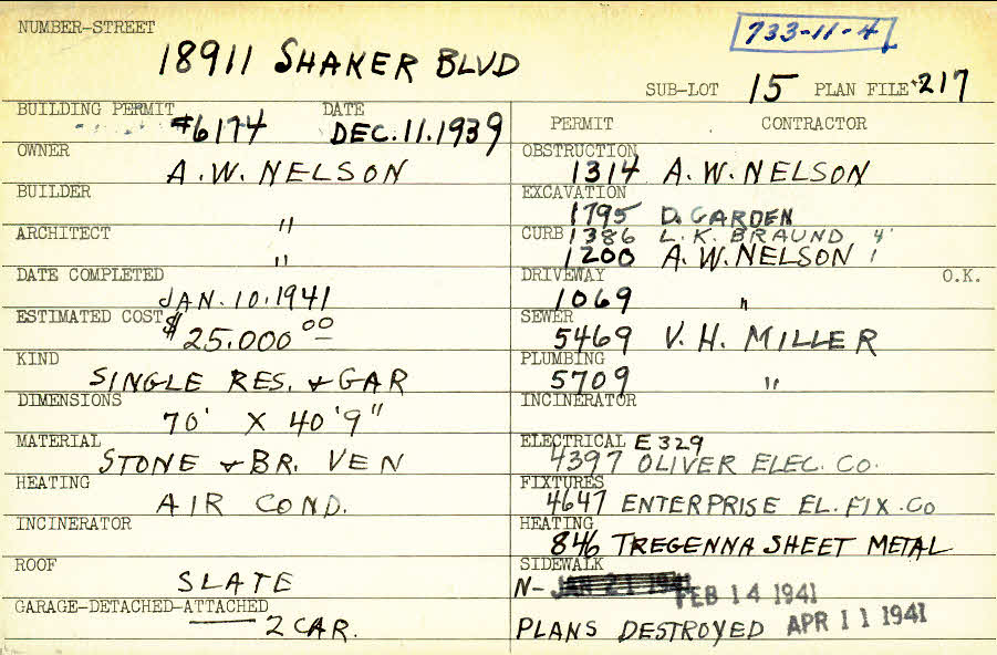 18911 Shaker Boulevard Shaker Heights, OH 44122 PARCEL ID: 733-11-004 Building Permit Date: 12-11-1939 Plan File Number: 217, 11972 Microfilm Roll: NewRoll#10 Neighborhood: Malvern Owner: Nelson, A. W. Builder: Nelson, A. W. Architect: Nelson, A. W. Estimated Cost: 25000 Date Completed: 01-10-1941 Kind: Single Dwelling and Garage Material: Stone and Brick Veneer Heating: Air Conditioned Roof: Slate Garage: attached 2 car |