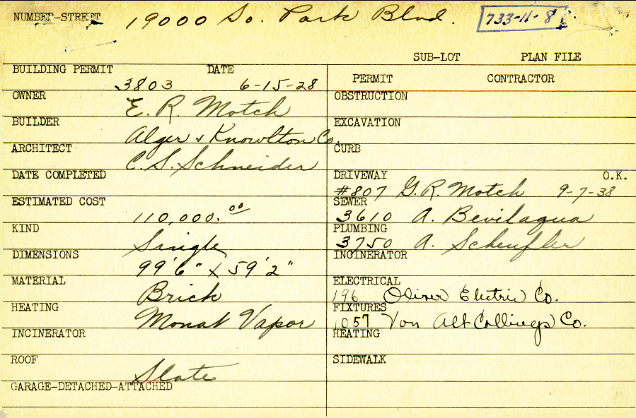 19000 South Park Boulevard Shaker Heights, OH 44120 PARCEL ID: 733-11-008 Building Permit Date: 06-15-1928 Plan File Number: 733, 7988 all scanned Microfilm Roll: Roll010, Roll095 Neighborhood: Malvern Owner: Motch, E. R. Builder: Alger and Knowlton Company Architect: Schneider, C. S. Estimated Cost: 110000 Kind: Single, Single Residence or Dwelling Material: Brick Heating: Vapor Roof: Slate Blueprints: online, see link above |