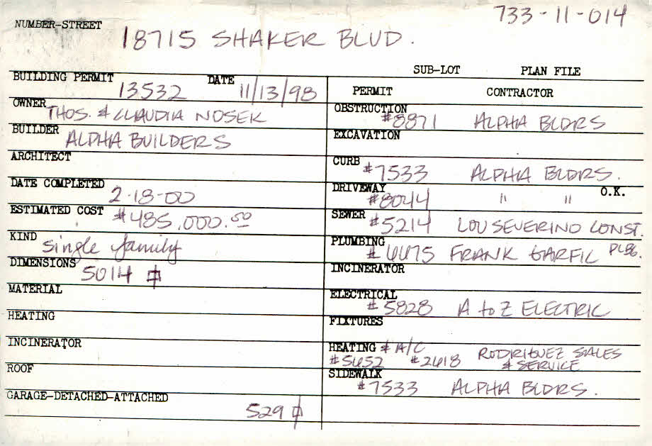 18715 Shaker Boulevard Shaker Heights, OH 44122 PARCEL ID: 733-11-014 Building Permit Date: 11-13-1998 Plan File Number: 0 Neighborhood: Malvern Owner: Nosek, Thomas and Claudia Builder: Alpha Builders Estimated Cost: 485000 Date Completed: 02-18-2000 Kind: Single, Single Residence or Dwelling |
