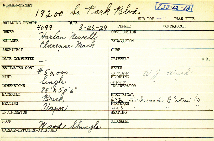 19200 South Park Boulevard Shaker Heights, OH 44120 PARCEL ID: 733-12-013 Building Permit Date: 03-26-1929 Plan File Number: 6928 Microfilm Roll: Roll#90 Neighborhood: Malvern Owner: Newell, Harlan Builder: Mack, Clarence Architect: Mack, Clarence Estimated Cost: 50000 Kind: Single, Single Residence or Dwelling Material: Brick Heating: Vapor Roof: Wood Shingle |