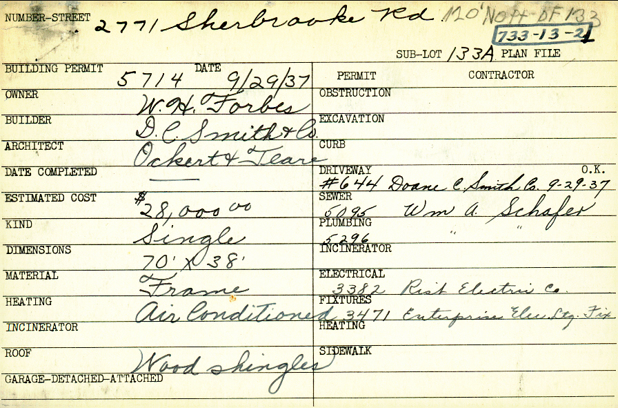 2771 Sherbrooke Road Shaker Heights, OH 44122 PARCEL ID: 733-13-002 Building Permit Date: 09-29-1937 Plan File Number: 0 Neighborhood: Malvern Owner: Forbes, W. H. Builder: D. C. Smith and Company Architect: Ockert, Paul and Teare, George W. Estimated Cost: 28000 Kind: Single, Single Residence or Dwelling Material: Frame Heating: Air Conditioned Roof: Wood Shingle |