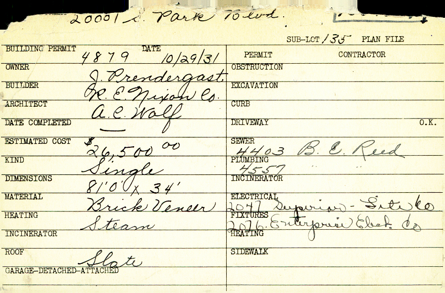20001 South Park Boulevard Shaker Heights, OH 44120 PARCEL ID: 733-13-004 Building Permit Date: 10-29-1931 Plan File Number: 4102 Microfilm Roll: Roll#60 Neighborhood: Malvern Owner: Prendergast, J. Builder: R. E. Nixon Company Architect: Wolf, A. C. Estimated Cost: 26500 Kind: Single, Single Residence or Dwelling Material: Brick Veneer Heating: Steam Roof: Slate |