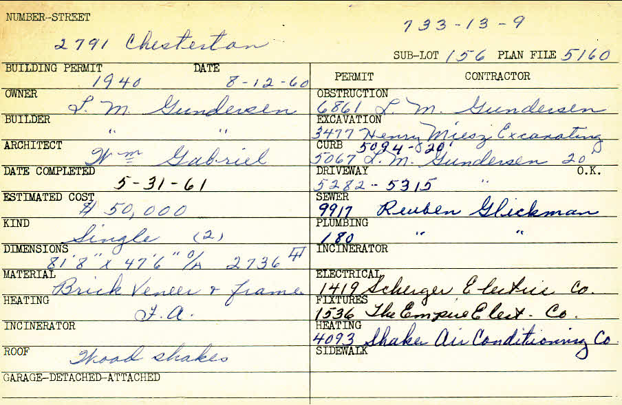 2791 Chesterton Road Shaker Heights, OH 44122 PARCEL ID: 733-13-009 Building Permit Date: 08-12-1960 Plan File Number: 5160 Microfilm Roll: Roll#70 Neighborhood: Malvern Owner: Gundersen, L. M. Builder: Gundersen, L. M. Architect: Gabriel, William Estimated Cost: 50000 Date Completed: 05-31-1961 Kind: Single, Single Residence or Dwelling (2) Material: Brick Veneer and Frame Heating: Forced Air Roof: Wood Shakes |