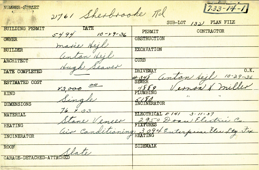 2761 Sherbrooke Road Shaker Heights, OH 44122 PARCEL ID: 733-14-001 Building Permit Date: 10-29-1936 Plan File Number: 1222 scanned, 5900, 6657, 6723 Microfilm Roll: Roll014, Roll#80, Roll#87, Roll#88 Neighborhood: Malvern Owner: Hejl, Marie Builder: Hejl, Anton Architect: Seaver, Hugh Estimated Cost: 23000 Kind: Single, Single Residence or Dwelling Material: Stone Veneer Heating: Air Conditioned Roof: Slate |