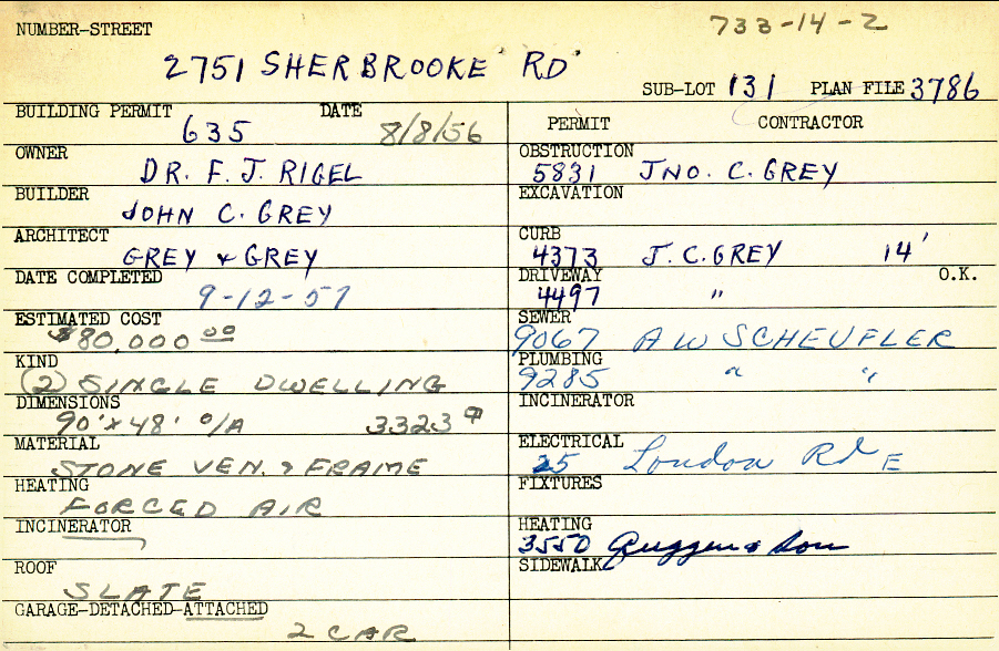 2751 Sherbrooke Road Shaker Heights, OH 44122 PARCEL ID: 733-14-002 Building Permit Date: 08-08-1956 Plan File Number: 3786, 11779 Microfilm Roll: Roll#56, NewRoll#9 Neighborhood: Malvern Owner: Rigel, Dr. F. J. Builder: Grey, John C. Architect: Grey and Grey Estimated Cost: 80000 Date Completed: 09-12-1957 Kind: Single, Single Residence or Dwelling (2) Material: Srone Veneer and Frame Heating: Forced Air Roof: Slate Garage: attached 2 car |