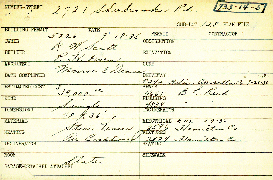 2721 Sherbrooke Road Shaker Heights, OH 44122 PARCEL ID: 733-14-005 Building Permit Date: 09-18-1935 Plan File Number: 5186, 5190, 11683 Microfilm Roll: Roll#70, NewRoll#8 Neighborhood: Malvern Owner: Scott, R. W. Builder: Owen, P. H. Architect: Deane, Monroe Ensign Estimated Cost: 39000 Kind: Single, Single Residence or Dwelling Material: Stone Veneer Heating: Air Conditioned Roof: Slate |
