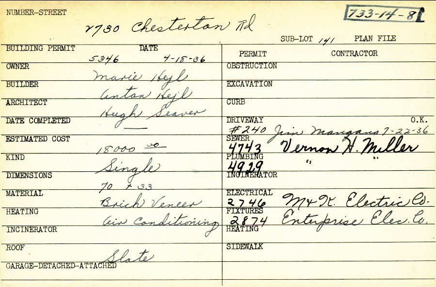 2730 Chesterton Road Shaker Heights, OH 44122 PARCEL ID: 733-14-008 Building Permit Date: 04-15-1936 Plan File Number: 0 Neighborhood: Malvern Owner: Hejl, Marie Builder: Hejl, Anton Architect: Seaver, Hugh Estimated Cost: 18000 Kind: Single, Single Residence or Dwelling Material: Brick Veneer Heating: Air Conditioned Roof: Slate |