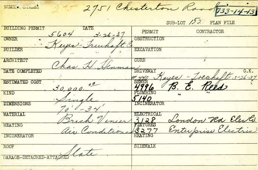 2751 Chesterton Road Shaker Heights, OH 44122 PARCEL ID: 733-14-013 Building Permit Date: 03-26-1937 Plan File Number: 12821 Microfilm Roll: NewRoll#18 Neighborhood: Malvern Owner: Keyes-Treuhaft Company Builder: Keyes-Treuhaft Company Architect: Hinman, Charles H. Estimated Cost: 30000 Kind: Single, Single Residence or Dwelling Material: Brick Veneer Heating: Air Conditioned Roof: Slate |
