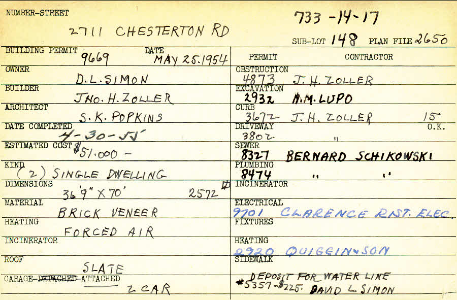 2711 Chesterton Road Shaker Heights, OH 44122 PARCEL ID: 733-14-017 Building Permit Date: 05-25-1954 Plan File Number: 2650 scanned, 7278 scanned Microfilm Roll: Roll037, Roll#92 Neighborhood: Malvern Owner: Simon, D. L. Builder: Zoller, John H. Architect: Popkins, S. K. Estimated Cost: 51000 Date Completed: 04-30-1955 Kind: Single, Single Residence or Dwelling (2) Material: Brick Veneer Heating: Forced Air Roof: Slate Garage: attached 2 car |