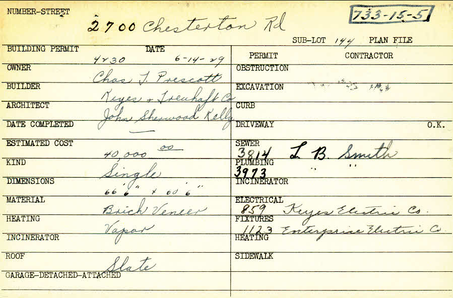 2700 Chesterton Road Shaker Heights, OH 44122 PARCEL ID: 733-15-005 Building Permit Date: 06-14-1929 Plan File Number: 4473, 4798, 11617 Microfilm Roll: Roll#63, Roll#66, NewRoll#8 Neighborhood: Malvern Owner: Prescott, Charles T. Builder: Keyes and Treuhaft Company Architect: Kelly, John Sherwood Estimated Cost: 40000 Kind: Single, Single Residence or Dwelling Material: Brick Veneer Heating: Vapor Roof: Slate |