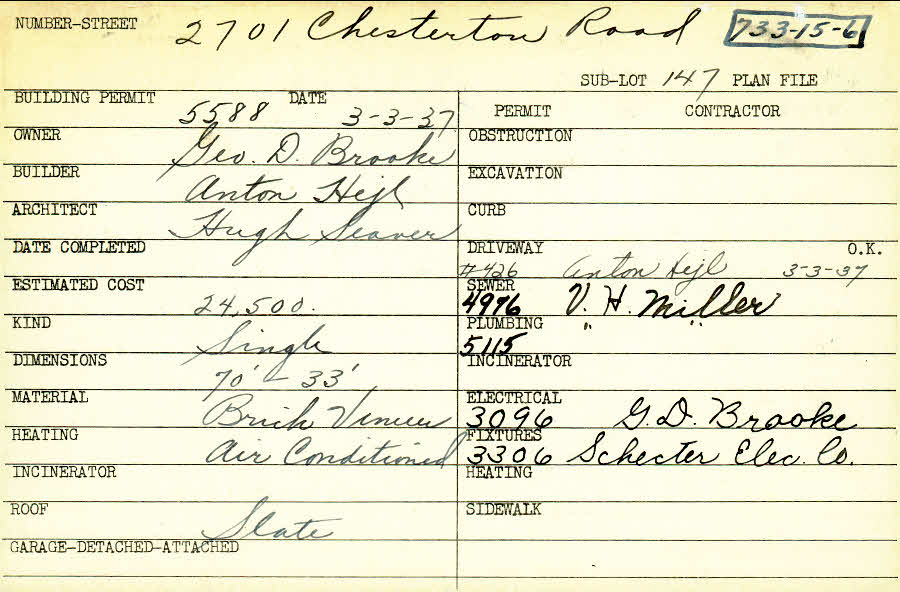 2701 Chesterton Road Shaker Heights, OH 44122 PARCEL ID: 733-15-006 Building Permit Date: 03-03-1937 Plan File Number: 7289 Microfilm Roll: Roll#92 Neighborhood: Malvern Owner: Brooke, George D. Builder: Hejl, Anton Architect: Seaver, Hugh Estimated Cost: 24500 Kind: Single, Single Residence or Dwelling Material: Brick Veneer Heating: Air Conditioned Roof: Slate |