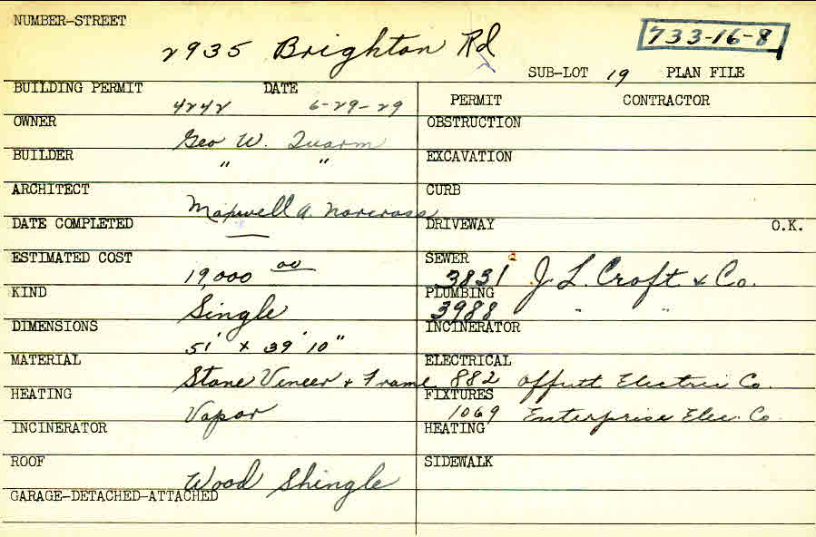 2935 Brighton Road Shaker Heights, OH 44120 PARCEL ID: 733-16-008 Building Permit Date: 06-29-1929 Plan File Number: 7932 Microfilm Roll: Roll#95 Neighborhood: Malvern Owner: Quarm, George W. Builder: Quarm, George W. Architect: Norcross, Maxwell A. Estimated Cost: 19000 Kind: Single, Single Residence or Dwelling Material: Stone Veneer and Frame Heating: Vapor Roof: Wood Shingle |