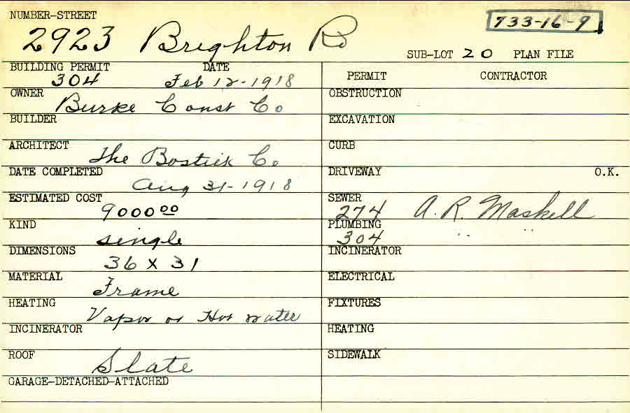 2923 Brighton Road Shaker Heights, OH 44120 PARCEL ID: 733-16-009 Building Permit Date: 02-12-1918 Plan File Number: 0 Neighborhood: Malvern Owner: Burke Construction Company Architect: The Bostick Company Estimated Cost: 9000 Date Completed: 08-31-1918 Kind: Single, Single Residence or Dwelling Material: Frame Heating: Vapor Roof: Slate |