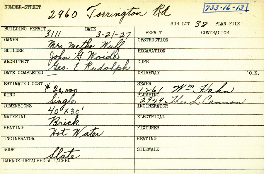 2960 Torrington Road Shaker Heights, OH 44122 PARCEL ID: 733-16-013 Building Permit Date: 03-21-1927 Plan File Number: 5333 Microfilm Roll: V Neighborhood: Malvern Owner: Wulf, Mrs. Metho Builder: Woide, John G. Architect: Rudolph, George E. Estimated Cost: 20000 Kind: Single, Single Residence or Dwelling Material: Brick Heating: Hot Water Roof: Slate |