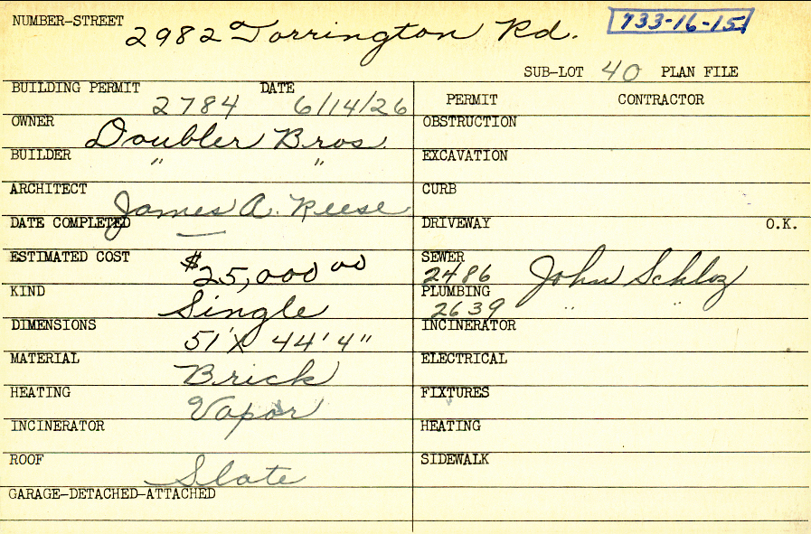 2982 Torrington Road Shaker Heights, OH 44122 PARCEL ID: 733-16-015 Building Permit Date: 06-14-1926 Plan File Number: 0 Neighborhood: Malvern Owner: Doubler Brothers Builder: Doubler Brothers Architect: Reese, James A. Estimated Cost: 25000 Kind: Single, Single Residence or Dwelling Material: Brick Heating: Vapor Roof: Slate |