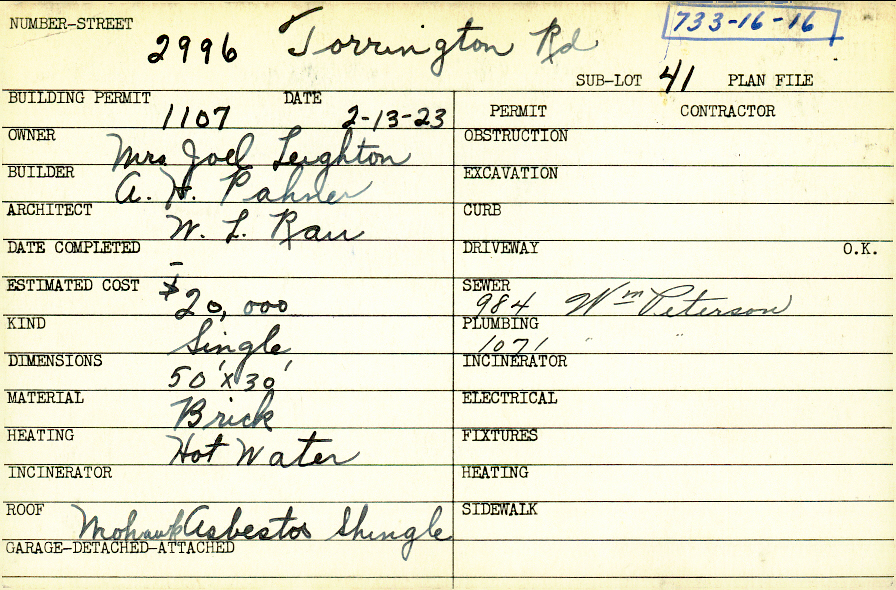 2996 Torrington Road Shaker Heights, OH 44122 PARCEL ID: 733-16-016 Building Permit Date: 02-13-1923 Plan File Number: 0 Neighborhood: Malvern Owner: Leighton, Mrs. Joel Builder: Pahner, A. H. Architect: Rau, W. L. Estimated Cost: 20000 Kind: Single, Single Residence or Dwelling Material: Brick Heating: Hot Water Roof: Asbestos Shingles |