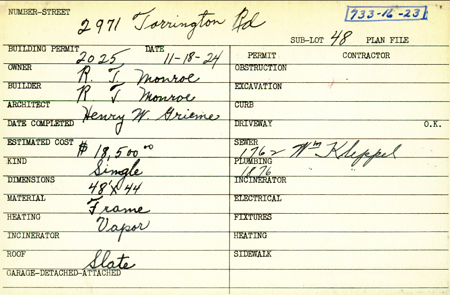 2971 Torrington Road Shaker Heights, OH 44122 PARCEL ID: 733-16-023 Building Permit Date: 11-18-1924 Plan File Number: 10538 Microfilm Roll: NewRoll#4 Neighborhood: Malvern Owner: Monroe, R. T. Builder: Monroe, R. T. Architect: Grieme, Henry W. Estimated Cost: 18500 Kind: Single, Single Residence or Dwelling Material: Frame Heating: Vapor Roof: Slate |