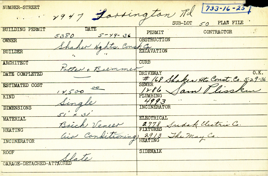 2947 Torrington Road Shaker Heights, OH 44122 PARCEL ID: 733-16-025 Building Permit Date: 05-29-1936 Plan File Number: 0 Neighborhood: Malvern Owner: Shaker Heights Construction Company Builder: Shaker Heights Construction Company Architect: J. Ellsworth Potter and Harry F. Bremmer Estimated Cost: 12500 Kind: Single, Single Residence or Dwelling Material: Brick Veneer Heating: Air Conditioned Roof: Slate |