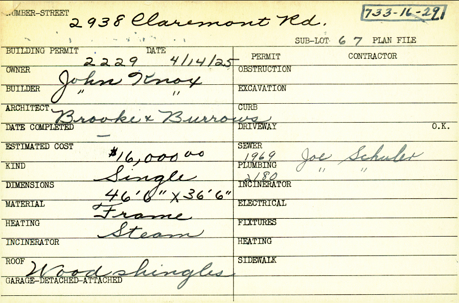2938 Claremont Road Shaker Heights, OH 44122 PARCEL ID: 733-16-029 Plan File Number: 3266, 5700 Microfilm Roll: Roll#47, Roll#77 Neighborhood: Malvern Owner: Knox, John Builder: Knox, John Architect: Brooke & Burrows Estimated Cost: 16000 Kind: Single, Single Residence or Dwelling Material: Frame Heating: Steam Roof: Wood Shingle |