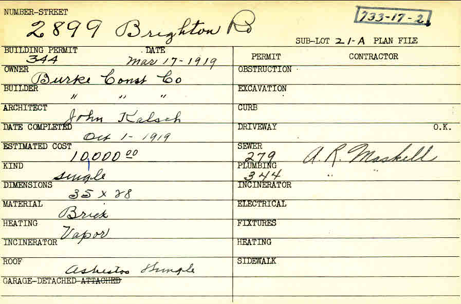 2899 Brighton Road Shaker Heights, OH 44120 PARCEL ID: 733-17-002 Building Permit Date: 03-17-1919 Plan File Number: 3888 Microfilm Roll: Roll#57 Neighborhood: Malvern Owner: Burke Construction Company Builder: Burke Construction Company Architect: Kalsch, John Estimated Cost: 10000 Date Completed: 10-01-1919 Kind: Single, Single Residence or Dwelling Material: Brick Heating: Vapor Roof: Asbestos Shingles Garage: detached |