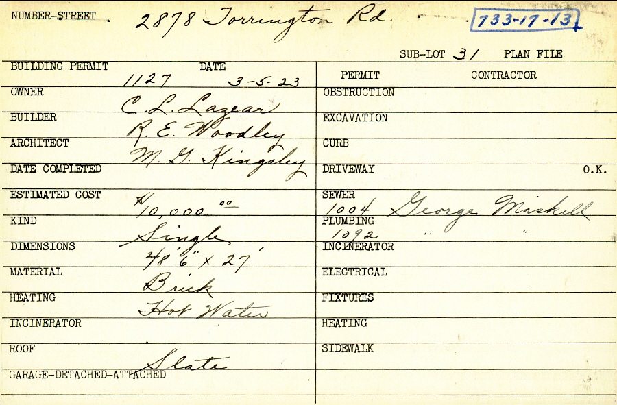 2878 Torrington Road Shaker Heights, OH 44122 PARCEL ID: 733-17-013 Building Permit Date: 03-05-1923 Plan File Number: 4471, 7322, 10882 Microfilm Roll: Roll#63, Roll#92, NewRoll#6 Neighborhood: Malvern Owner: Lazear, C. L. Builder: Woodley, R. E. Architect: Kingsley, M. G. Estimated Cost: 10000 Kind: Single, Single Residence or Dwelling Material: Brick Heating: Hot Water Roof: Slate |